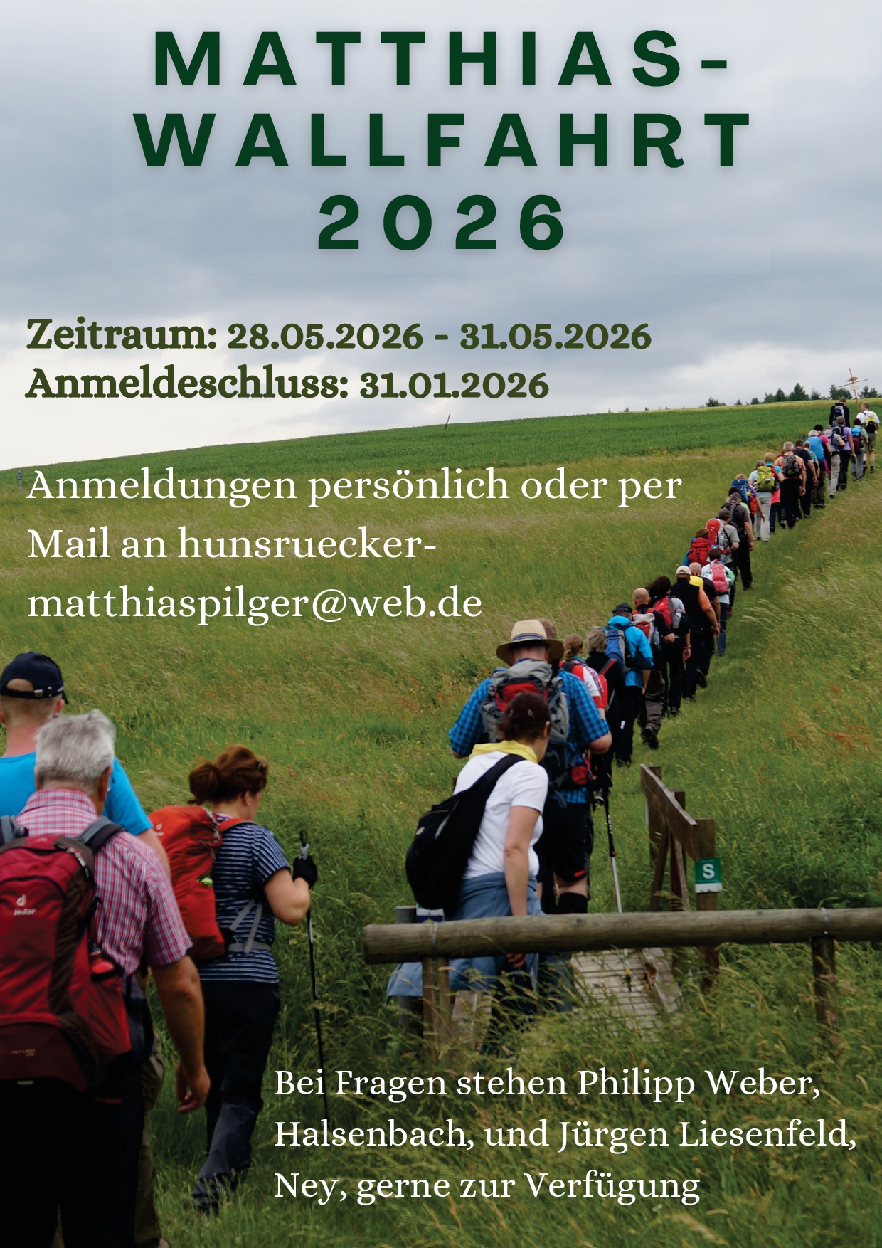 In dem Zeitraum vom 28.05.2026 bis zum 31.05.2026 werden wir wieder nach Trier pilgern. Anmeldungen bitte persönlich oder per E-Mail an hunsruecker-matthiaspilger@web.de bis spätestens 31.01.2026.