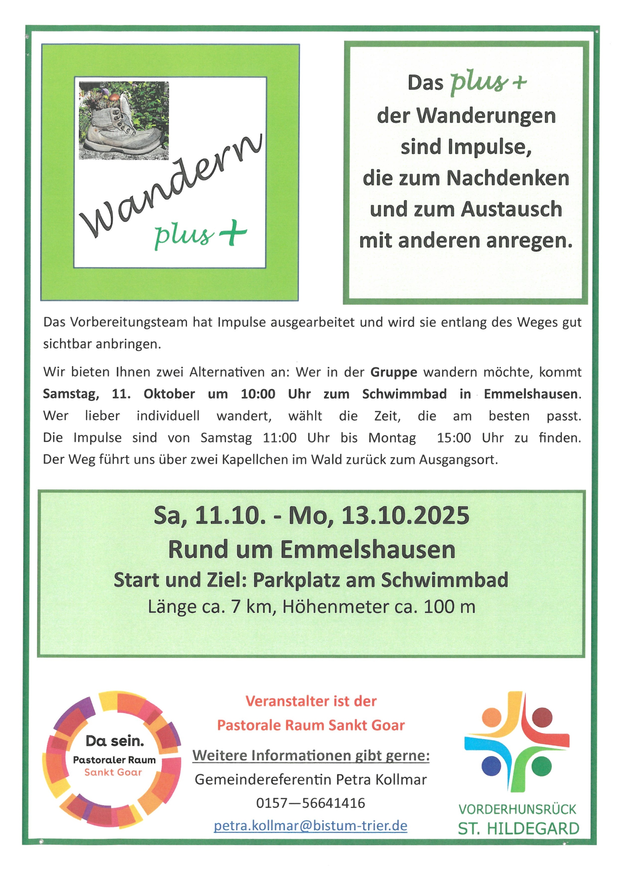 Wir bieten Ihnen zwei Alternativen an: Wer in der Gruppe wandern möchte, kommt am Samstag, 11. Oktober um 10:00 Uhr zum Schwimmbad in Emmelshausen. Wer lieber individuell wandert, wählt die Zeit, die am besten passt.